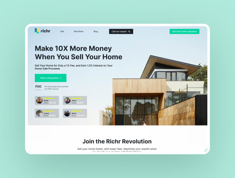 Richr empowers home owners to make more money on the sale of their home at closing and beyond. With only 1% commission paid at closing, sellers can list their home for free with no commitment. By choosing to Richr, sellers get exclusive access to Richr Money -- the first wealth management solution designed specifically for home sellers.